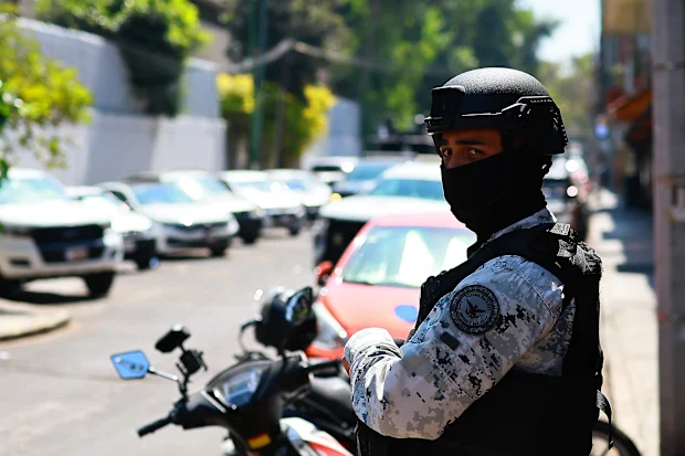 Um oficial da Guarda Nacional monta guarda em frente à Fiscalia Especializada en Materia de Delincuencia Organizada.