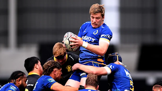 Fabian Holland, de Otago, recolhe a bola de um alinhamento lateral.