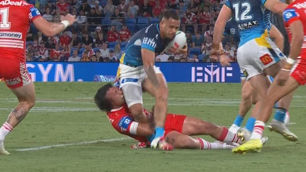 Um caso de fogo amigo causou cenas angustiantes no Cbus Super Stadium com o quinto oitavo Kyle Flanagan dos Dragões saindo do campo contra os Titãs.