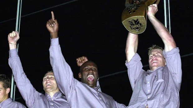 Brad Thorn comemora a vitória na premiership com Wendell Sailor e Michael De Vere.